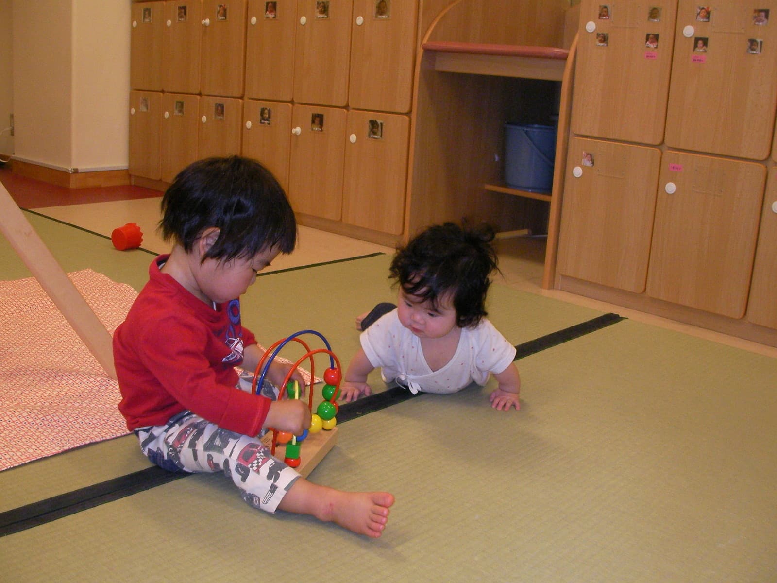 因此,保育人员不仅仅需要准备好宽敞的场所,还需要准备好能够使婴幼儿产生爬行欲求的环境。同时,准备这个环境时最重要的一点,就是应该准备比这个孩子当时的能力稍微超前一点的环境,也就是说,当孩子需要取东西时,应该把东西放在比那个孩子能够爬到的地方稍远一点的地方等,如果想让保育人员抱时,保育人员就应该在稍微有些距离的地方等着孩子。应该注意那个孩子的发育情况,准备好比那个孩子的能力稍稍超前一点的课题。很好地理解孩子的发育过程,则是保育人员所谓的专业性之一。